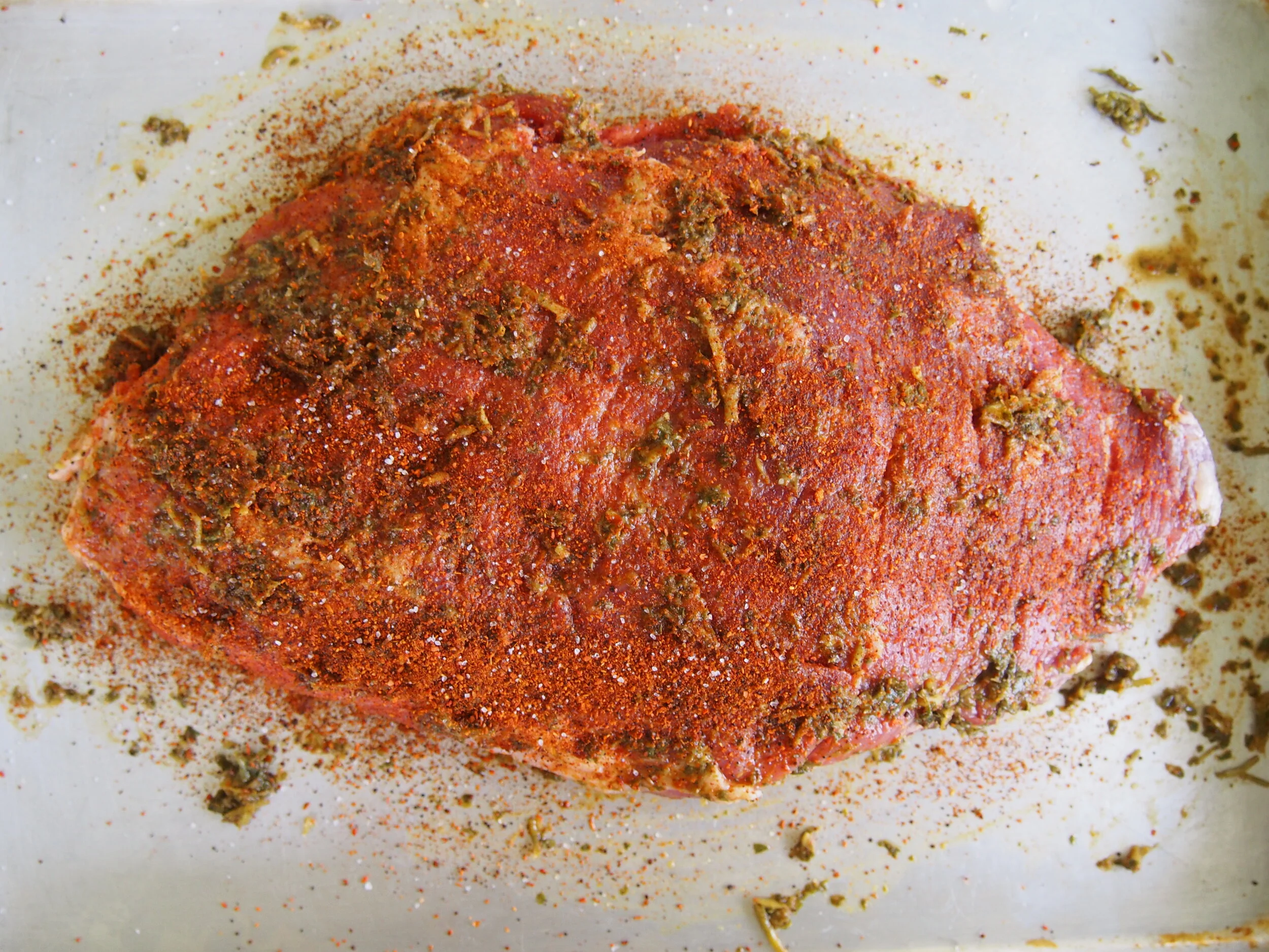 Add the carrot tops, olive oil, vinegar, cilantro, garlic cloves, red pepper, cumin, and sea salt into a food processor and process until well combined. If you need to add more olive oil or vinegar to get the right consistency, do so at a roughly 2:1 ratio. You want it to be kind of like pesto, maybe a bit more liquid than that. Smear the chimichurri all over the serratus, reserving leftovers chimichurri for another day. Sprinkle the smoked paprika generously over the chimichurri-rubbed meat, and then refrigerate, uncovered, for at least an hour, and as many as 3 hours.